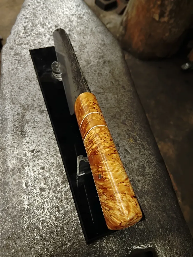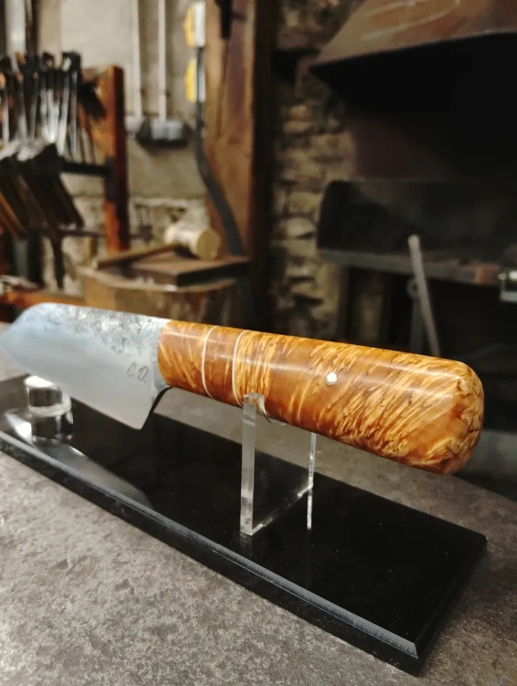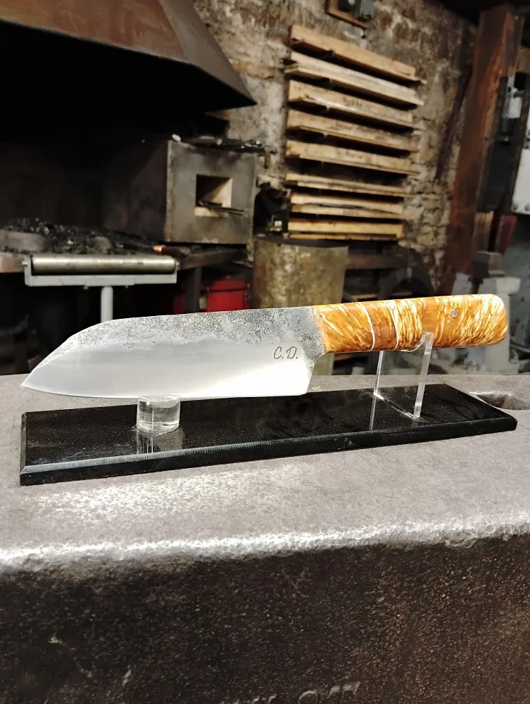 Stage de forge coutellerie en Bourgogne : lame forgée, manche en loupe de bouleau de Camélie stabilisée