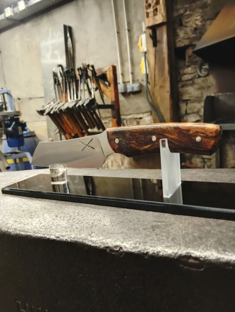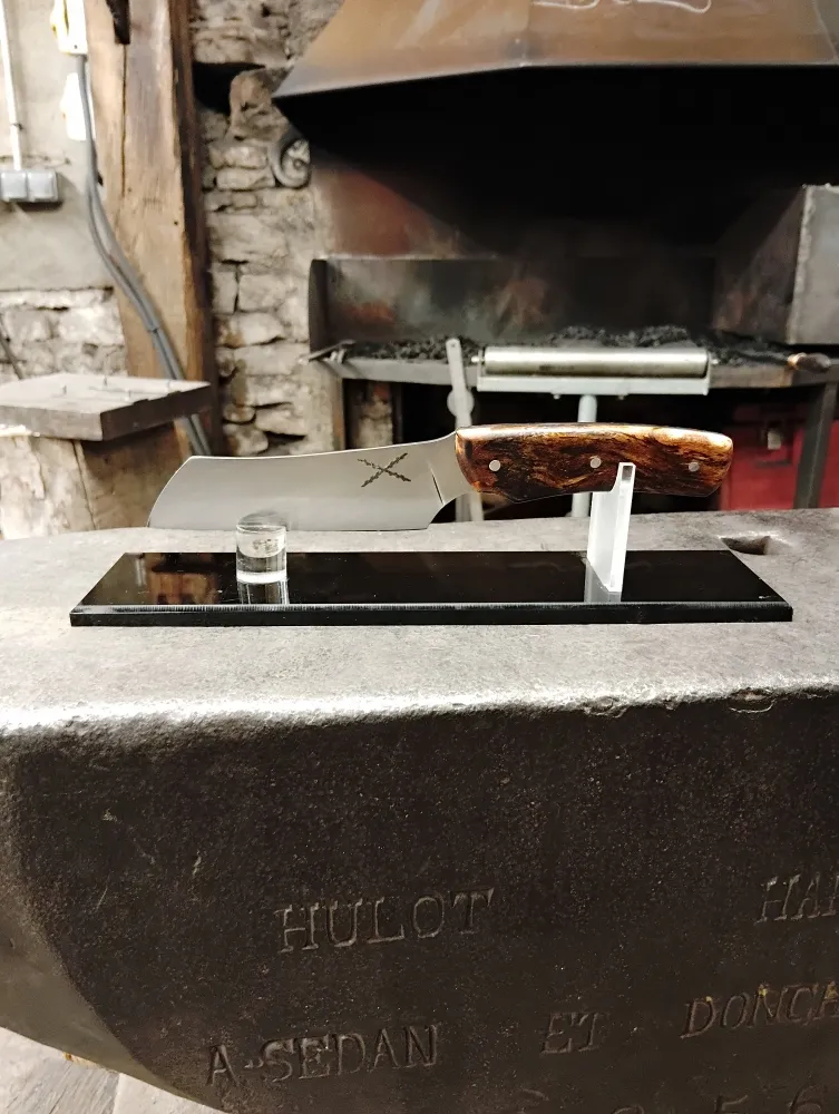 Hugo est venu tout droit d’Annecy pour vivre une expérience unique à O Feu Forgé, situé à Vielverge, au cœur de la Bourgogne. En une journée, il a réalisé son rêve de créer son propre couteau. Inspiré des réalisations des autres stagiaires, Hugo a choisi de fabriquer un petit nakiri, un couteau simple, "mimi", mais surtout très efficace en cuisine. Pour ajouter une touche locale, il a intégré le symbole de la croix de Saint-André, rendant hommage à la région. Le manche, quant à lui, est fait de cep de vigne, une matière rare et pleine de caractère, conférant au couteau une histoire et une âme unique.