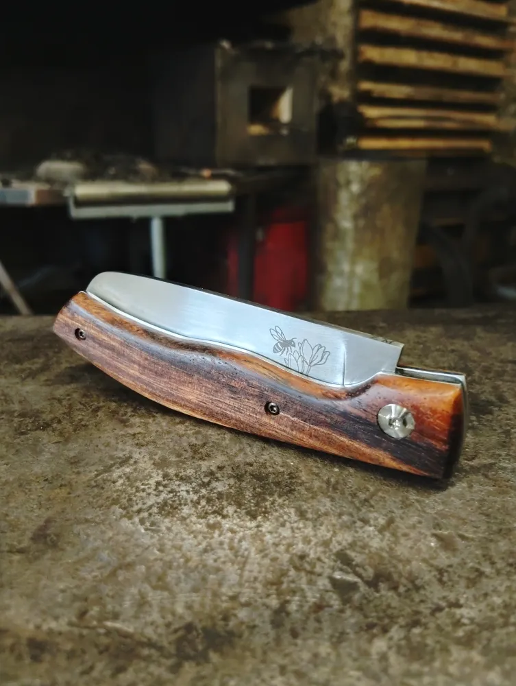 Le manche en bois d’Albizia, aux tons chauds et profonds, vient parfaire la pièce : une création unique, élégante et personnelle.