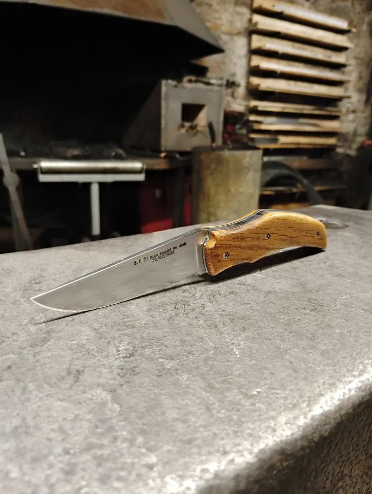 Chez O Feu Forgé, j' offre des stages de découverte pour les particuliers et les professionnels. Que vous soyez à Dijon, Besançon, Langres ou Chalon-sur-Saône, notre atelier à Vielverge est facilement accessible. Étienne a vécu une expérience unique en s'immergeant dans le processus de création d'un couteau artisanal. Ajustements, précision, mécanique... il a géré les montages avec sérieux et finesse. Quelques légers défauts esthétiques sont apparus, mais ce sont ces imperfections qui signent l'authenticité d'un couteau façonné à la main.
