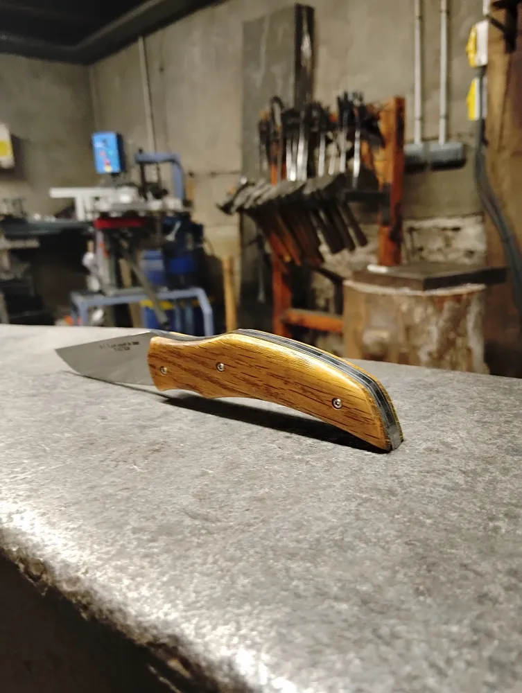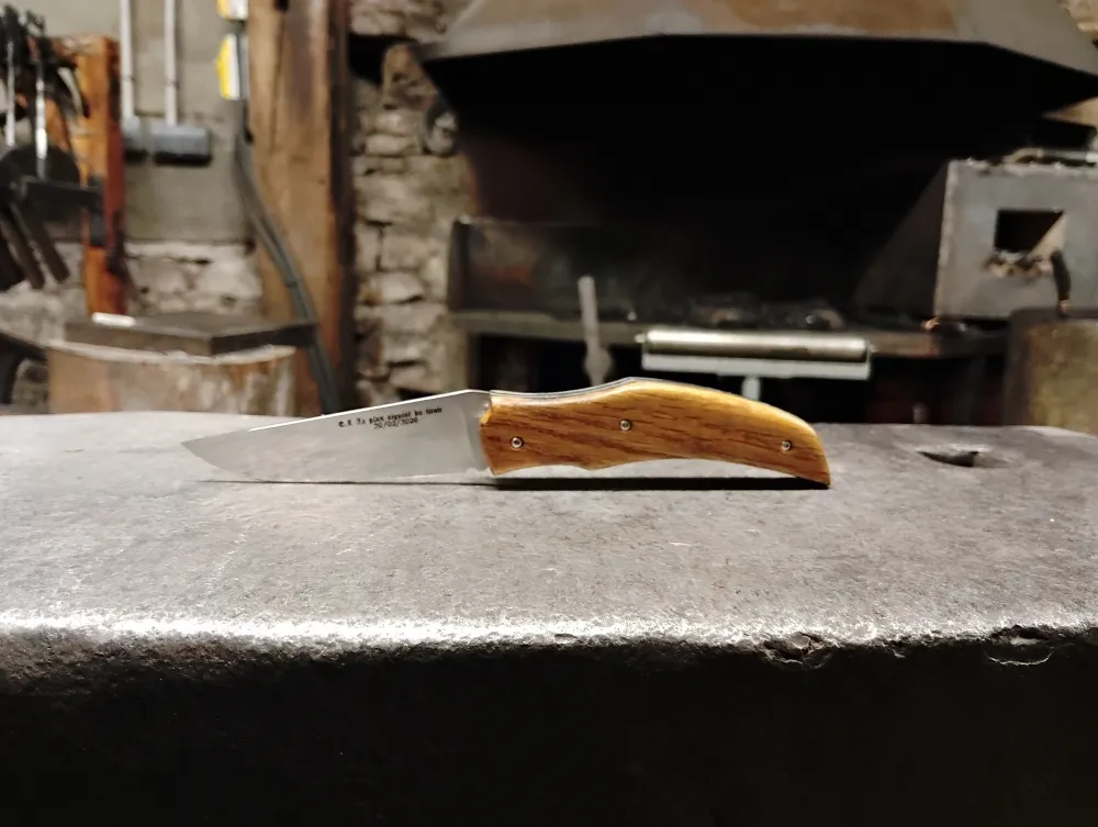 Le choix du manche d'Étienne s'est porté sur un chêne chargé d'histoire, ayant servi à la fixation d'une cloche d'église du XVIIᵉ siècle. Ce bois, marqué par le temps, confère à son Victorus une âme particulière. Chaque couteau fabriqué chez O Feu Forgé est une pièce unique, un couteau de tous les jours, mais aussi un couteau d'expérience.