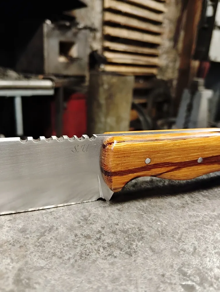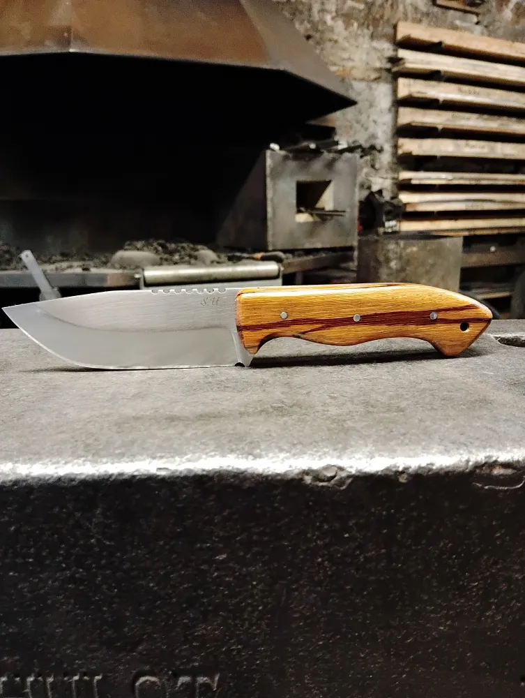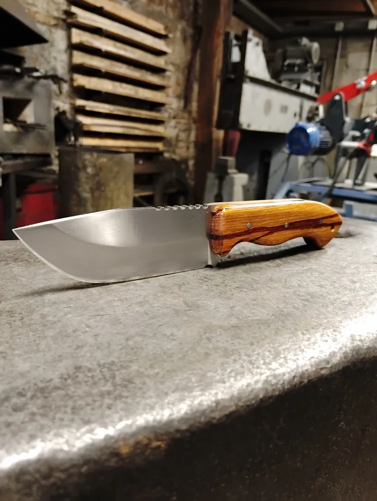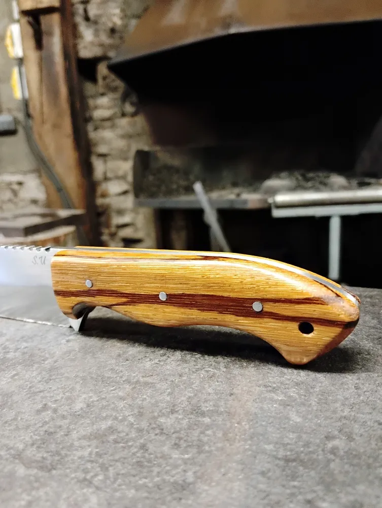 Le résultat ? Un couteau robuste et élégant, habillé d’un manche en bois de serpent aux veines dorées et contrastées, qui donne à la pièce un caractère unique.