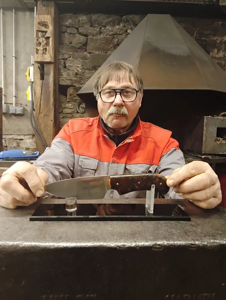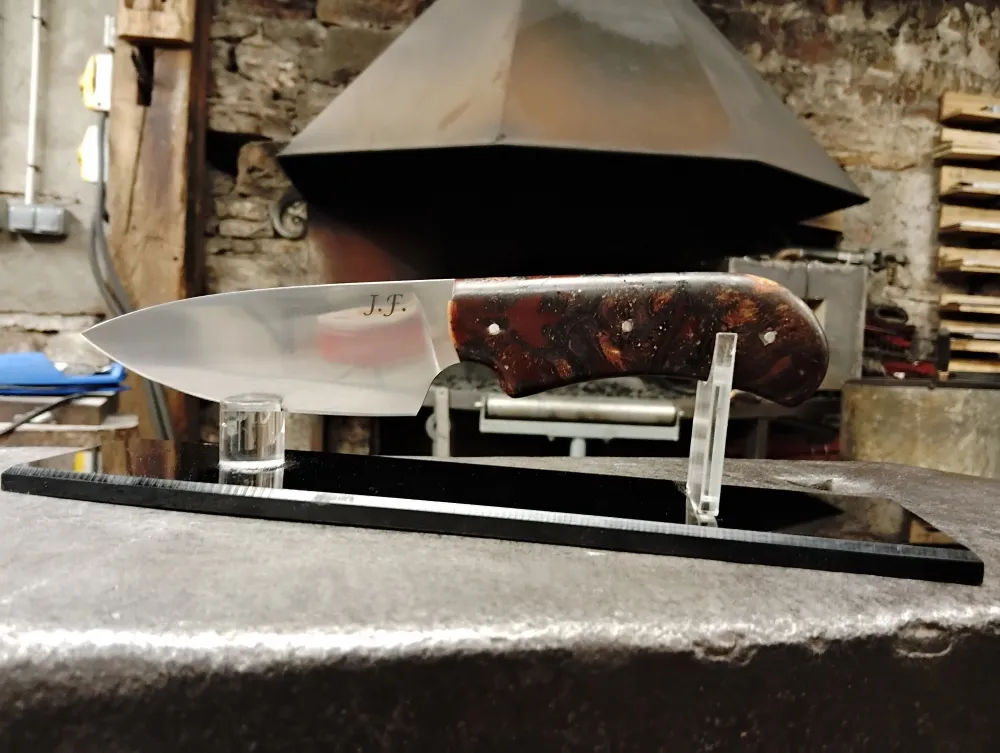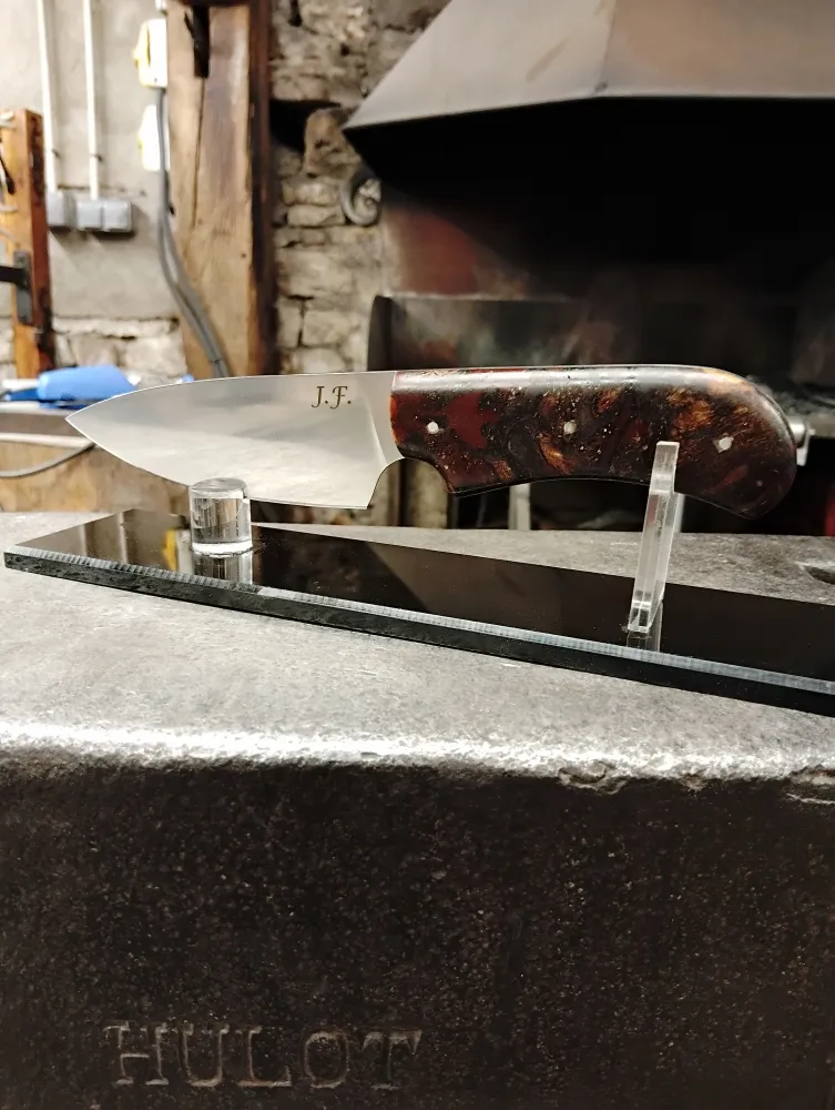 Jean-François, retraité… mais jamais à court d’énergie. Même avec un emploi du temps bien rempli, il a choisi de consacrer une journée entière à la création de son couteau, en méthode stock removal. Parti d’une feuille blanche, sans idée précise au départ, il a trouvé son inspiration, fait ses choix et donné naissance à un couteau utilitaire, simple, efficace et pensé pour servir. Originaire de Beaune, le choix du manche s’est imposé naturellement : un cep de vigne, chargé de sens et de caractère. Une prise en main confortable, une lame résistante, un premier couteau de toute beauté. Et surtout, un couteau qui est le sien, créé de ses propres mains.