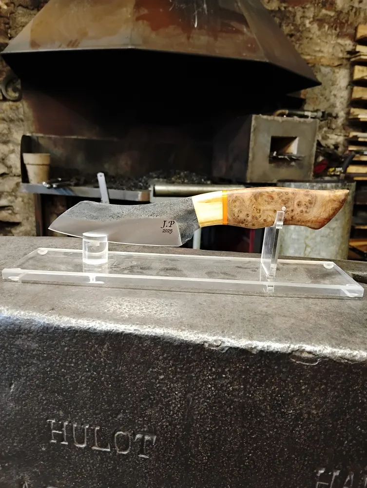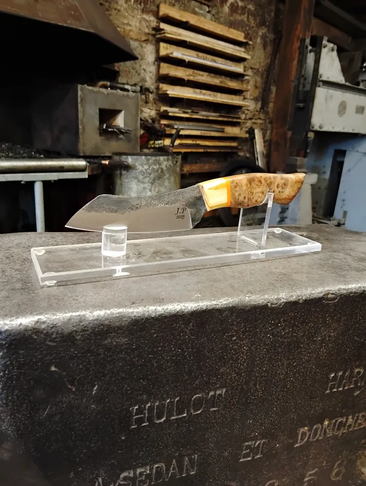 O Feu Forgé, situé à Vielverge, est un atelier de Coutellerie reconnu pour son expertise dans la fabrication artisanale de couteaux et autres objets en fer forgé. Récemment, Jean Pierre, un passionné en quête d'une nouvelle expérience, est venu découvrir l'art de la coutellerie dans ma forge. Ne sachant pas quoi faire initialement, il a été inspiré par notre vitrine et a décidé de créer un couteau outdoor.