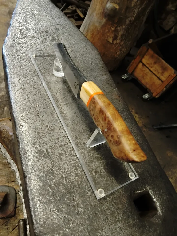 Guidé par notre maître forgeron, Jean Pierre s'est lancé dans la fabrication de son propre couteau. Malgré quelques coups de marteau trop appuyés, rapidement corrigés par notre expert, il s'est débrouillé comme un chef. Jean Pierre a choisi avec soin les matériaux pour son couteau : un manche en Chechen, une mitre en olivier et un insert orange en G10, créant ainsi une pièce unique et personnalisée.