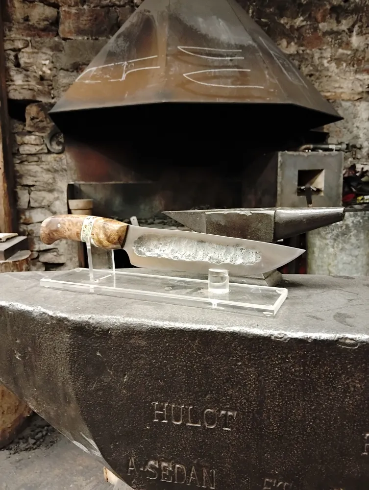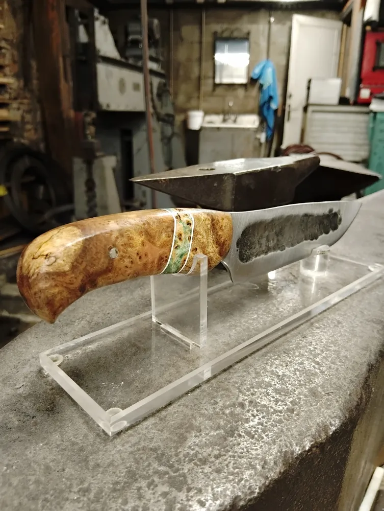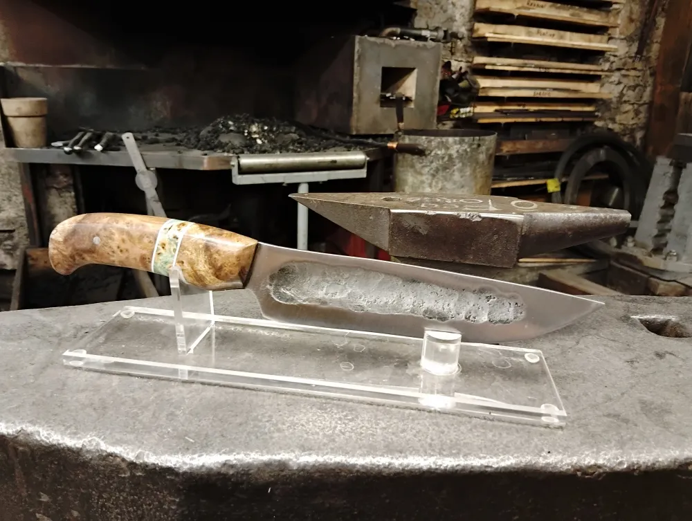 O Feu Forgé, situé à Vielverge, est fier de partager une nouvelle réussite dans le domaine de la coutellerie artisanale. David, un passionné de forge, a récemment terminé un stage où il a créé son propre couteau avec une lame Yakut. Grâce à sa motivation et sa concentration, il a su réaliser une pièce unique, choisissant avec soin une loupe de peuplier stabilisé de différentes couleurs pour le manche. Ce couteau, qu'il pourra utiliser fièrement, est le reflet de son engagement et de son talent.