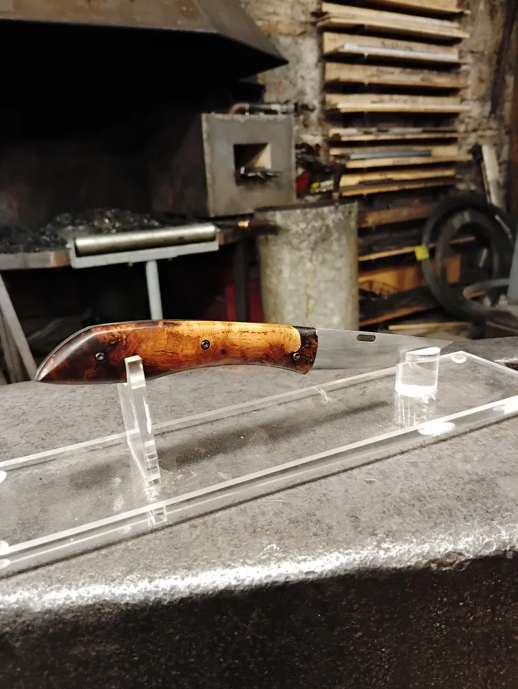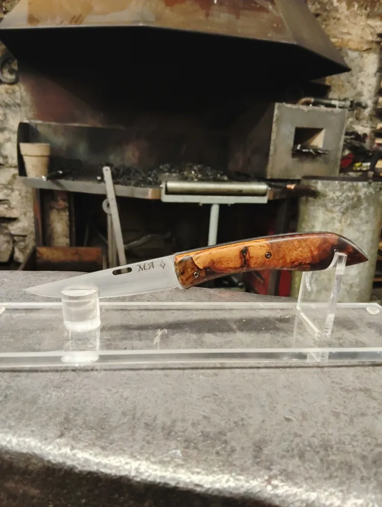 Chez O Feu Forgé, chaque création est le fruit d'un savoir-faire ancestral et d'une passion pour la coutellerie. Notre atelier, situé à Vielverge, est un lieu où l'art de la forge prend vie sous les mains expertes de nos artisans. Nous proposons une large gamme de services, allant de la fabrication artisanale de couteaux pliants sur-mesure à la forge de coutellerie.