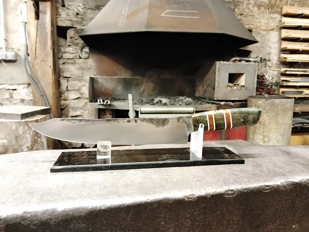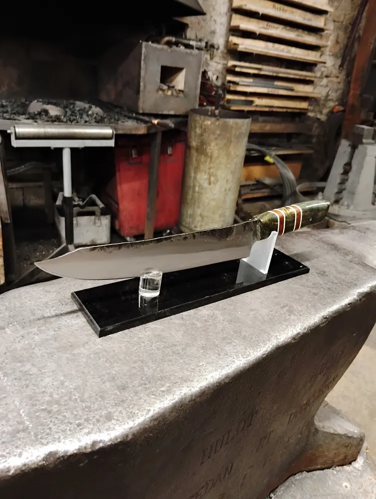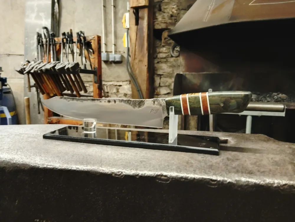 Mais l'aventure ne s'est pas arrêtée là. Patrik a ensuite appris à réaliser l'émouture à la forge, un processus complexe qui demande patience et précision. Pour le manche, il a choisi un frêne-olivier stabilisé teinté, agrémenté d'intercalaires blancs et bois, une combinaison qui donne du caractère à son couteau.