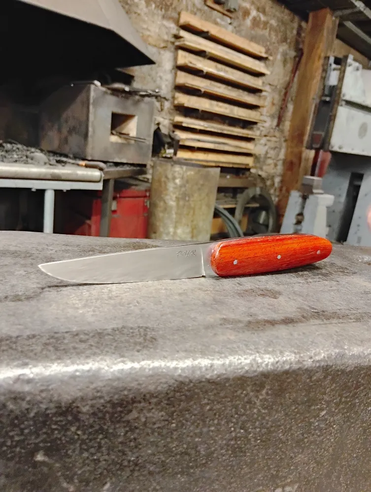 Curieux de comprendre les gestes du coutelier, il s’est lancé dans la réalisation d’un couteau de table, façonné entièrement à la main selon la méthode stock removal — un travail de patience où la lame se révèle peu à peu sous les outils.
