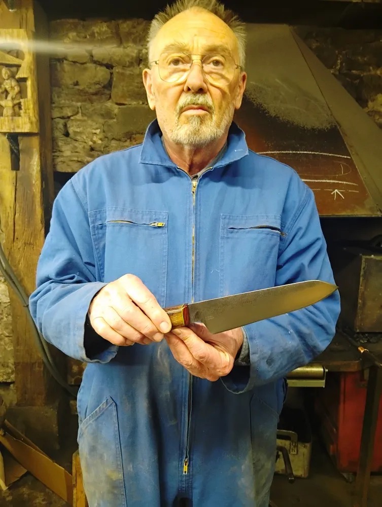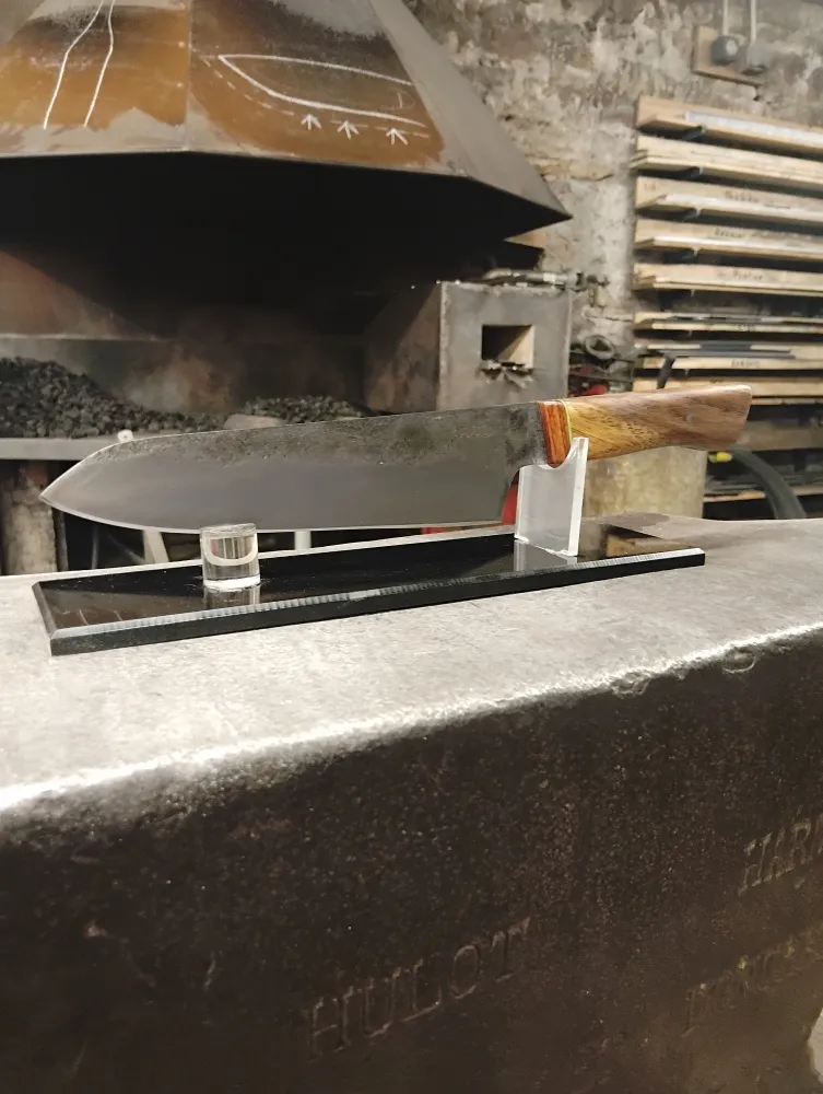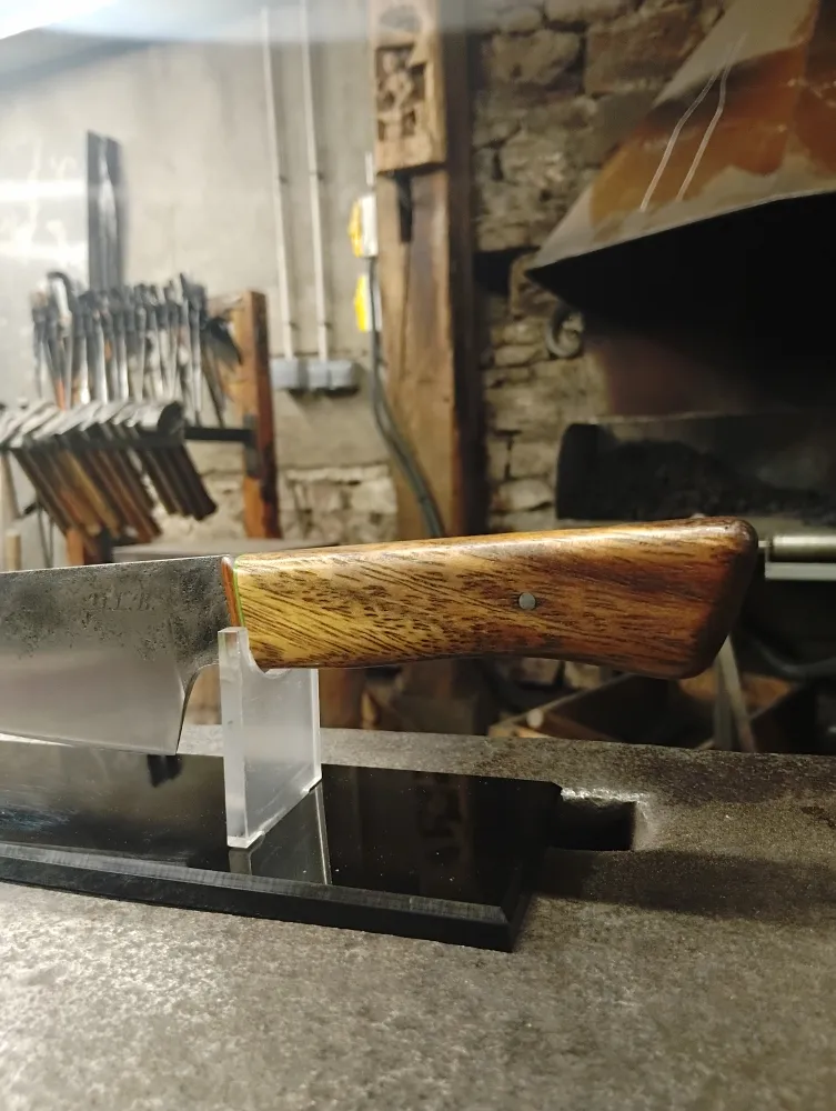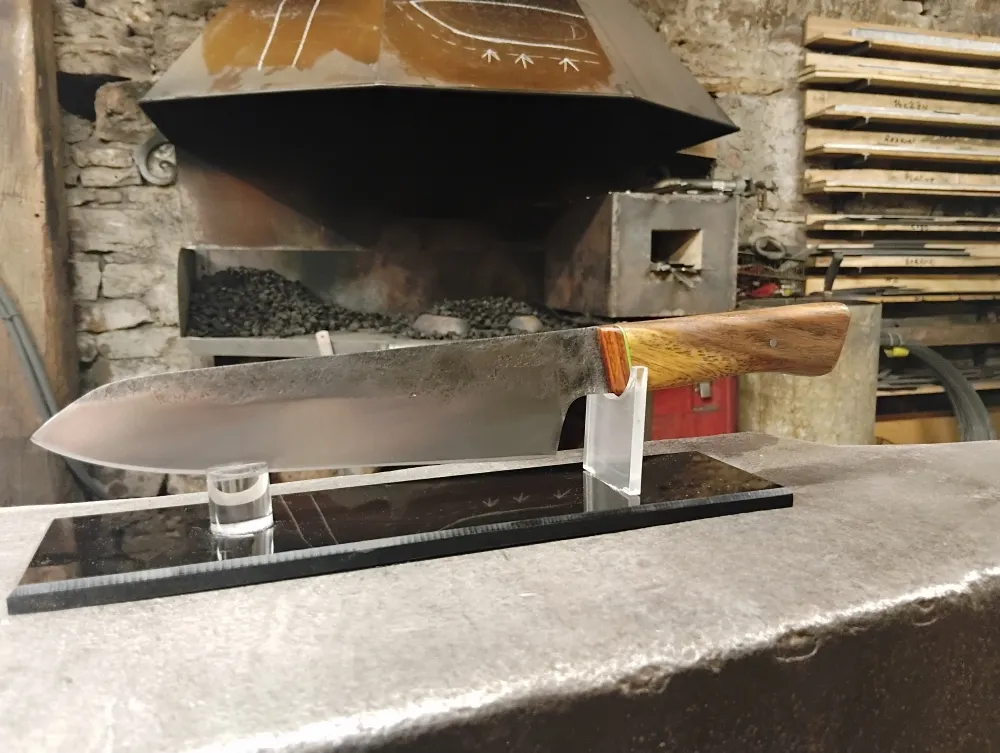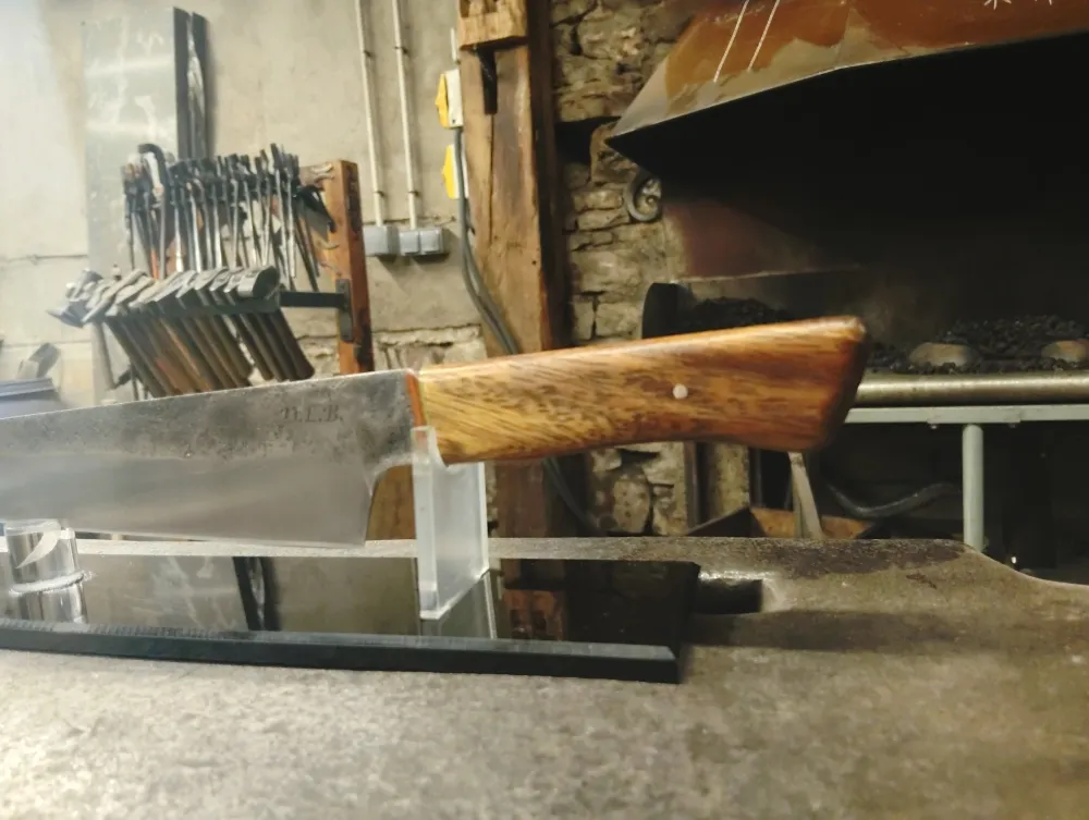 Chez O Feu Forgé, situé à Vielverge, nous avons eu le plaisir d'accueillir Didier, un passionné de coutellerie, avec un projet ambitieux en tête. Son dessin initial, bien que complexe, a été le point de départ d'une collaboration enrichissante. Ensemble, nous avons retravaillé son idée pour qu'elle soit réalisable dans le temps imparti du stage, tout en restant fidèle à sa vision.