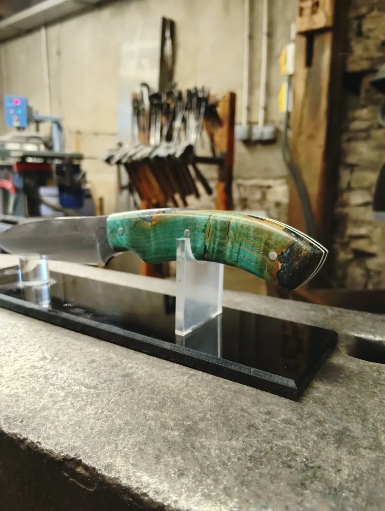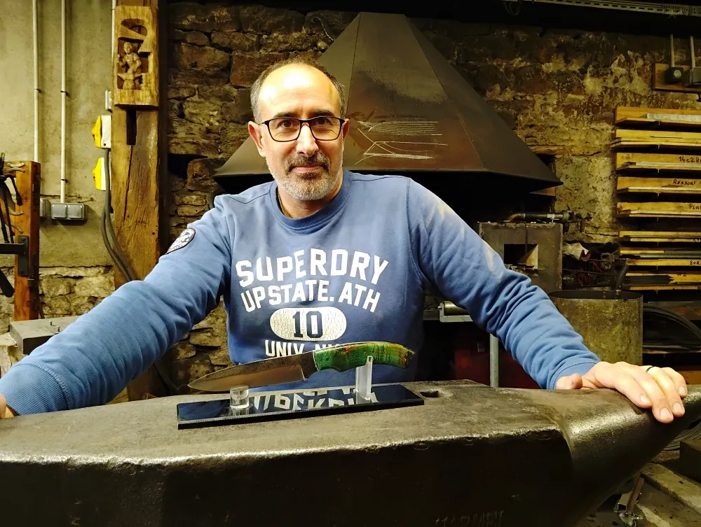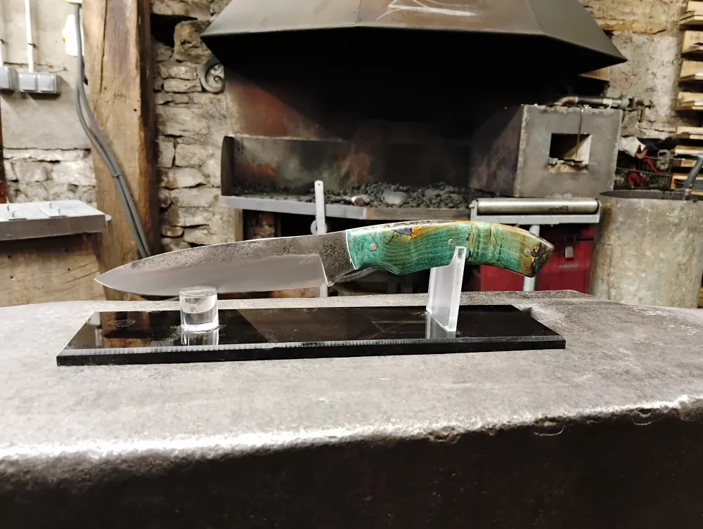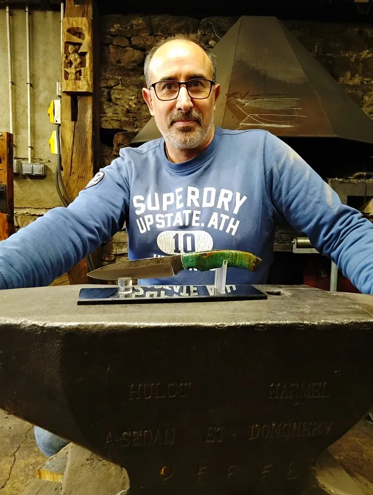 Chez O Feu Forgé, j' ai eu le plaisir d'accueillir Stéphane pour son troisième stage de forge. Après avoir acquis de l'expérience chez un confrère en France, il a choisi de venir à Vielverge pour découvrir une autre approche de la coutellerie. Son ambition était de s'imprégner de gestes nouveaux et de valeurs différentes, propres à mon atelier.