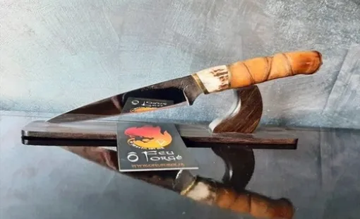 Manche en bois de cerf avec sa couronne, mitre en os entre intercalaire en inox et corne de zébu pour la garde.